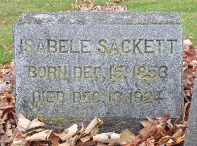Isabelle Sackett, daughter of Harrison P Sackett and Caroline Matthews, was born in Danbury, Ottawa County, OhioG, on 15 December 1856.1,2,3 She died there aged 67 on 13 December 1924 and was buried at Oakland Cemetery, Sandusky, Erie County, OhioG.3