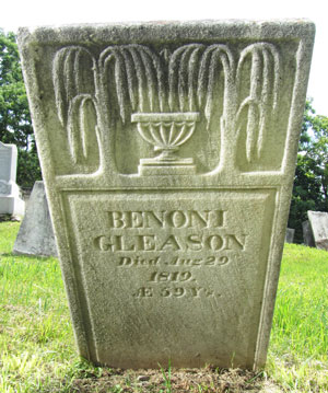 Benoni Gleason, son of Jacob Gleason and Ruth Sacket, was born in Pittsfield, Berkshire County, MassachusettsG, about 1760.1,2 He died aged 59 in Benson, Rutland County, VermontG, on 29 August 1819 and was buried at Old Benson CemeteryG.4,3 He married in PittsfieldG Lucy Hubbard, daughter of Captain James Hubbard and Martha Livermore.3 Lucy was born in PittsfieldG on 3 November 1766.3 She died aged 63 in BensonG on 6 February 1830 and was buried at Old Benson CemeteryG.3