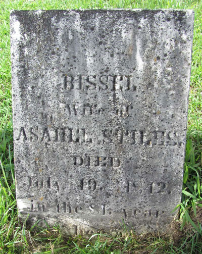 Bissel Gleason, daughter of Jacob Gleason and Ruth Sacket, was born on 15 June 1761.1 She died aged 81 in Benson, Rutland County, VermontG, on 19 July 1842 and was buried at Old Benson CemeteryG.1 She married on 17 June 1784, Asahel Stiles, son of Zebediah Stiles and Experience Wells.1 Asahel was born in Pittsfield, Berkshire County, MassachusettsG, on 29 November 1759.1 He died aged 94 in BensonG on 13 April 1854 and was buried at Old Benson CemeteryG.1