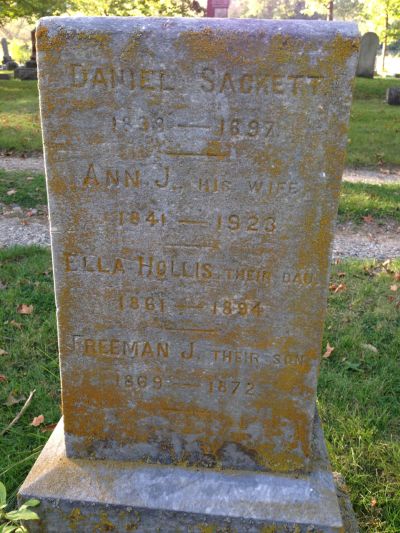 Daniel L Sackett, son of Freeman Sackett and Elenora Perselia Noble, was born in MassachusettsG on 25 December 1837.1 He died in Dexter, Washtenaw County, MichiganG, on 11 June 1897. He married about 1860, Ann Jane Hanna. Ann was born in Ann Arbor, Washtenaw CountyG, on 28 March 1841. She died aged 82 in Detroit, Wayne County, MichiganG, on 21 May 1923.