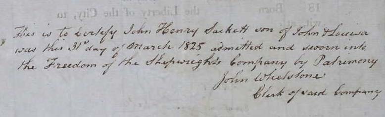 John Henry Sackett's certificate of admission to Shipwright's Company 31 March 1825