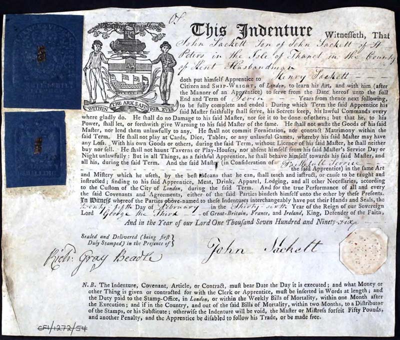 John Sackett's apprenticeship indenture 25 February 1796